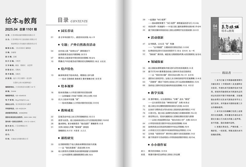 《东方娃娃绘本与教育》杂志是一本专注于儿童阅读与教育的期刊,以推广绘本文化、提升儿童阅读兴趣和教育质量为目标,为家长、教育工作者以及绘本爱好者提供学习和交流的平台。该杂志致力于通过绘本这一独特的艺术形式,结合先进的教育理念和方法,为孩子们提供高质量的阅读材料,促进他们的全面发展。杂志以东方文化元素为特色,旨在传承中华优秀传统文化,培养孩子们的民族自豪感和文化自信心。